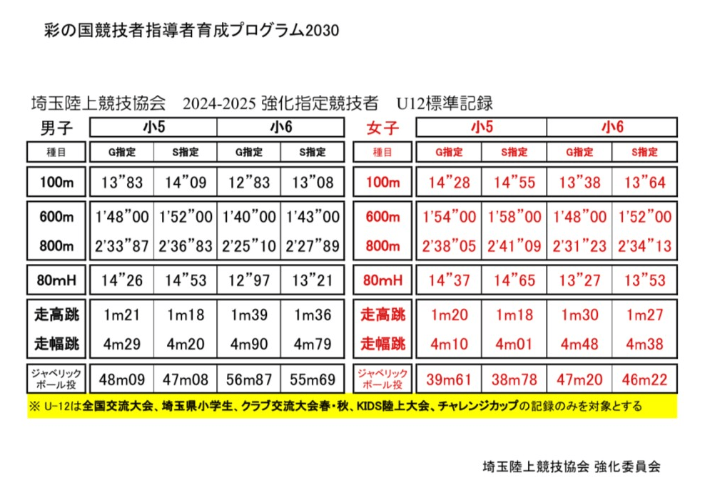 本大会は小学生の強化標準突破の指定大会になります。強化タイムは以下のタイムになります。
